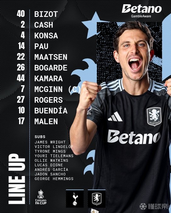 维拉首发:40-比佐、22-马特森、2-卡什、4-孔萨、14-保-托雷斯、26-博加德、27-摩根-罗杰斯、44-卡马拉、10-布恩迪亚、7-麦金、17-马伦